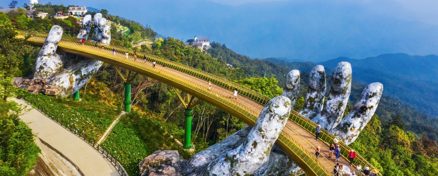 斥資20億美金打造的巴拿山《黃金佛手橋》,從海拔近1,500公尺的山壁伸出一雙古代巨手,還特別刻出巨手上的裂痕與青苔,超有歷史感!沒有雲霧時可眺望到峴港的海灣、雲霧來時,《黃金佛手橋》若隱若現,有種漫步雲端上的錯覺。