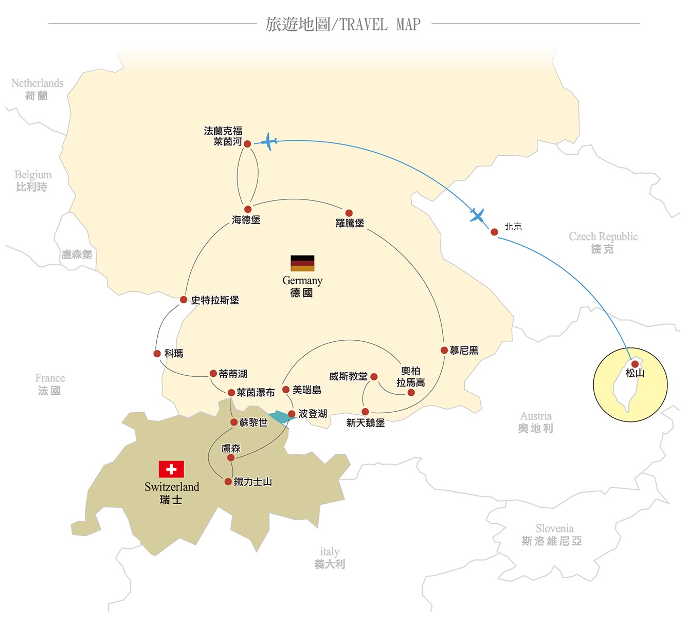 德國瑞士浪漫之旅的尾端,心中美好的風景和團員們一路上的歡笑,今天帶著依依不捨的心情前往機場,由領隊協助辦理登機手續,搭乘豪華客機經由北京轉機,返回桃園國際機場。