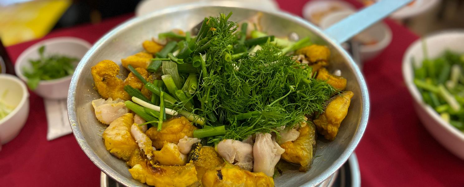 鱧魚鍋,選用薑黃醃製的魚塊,炸至外酥內嫩後,再拌入大量蒔蘿與蔥段熱炒,香氣四溢,風味獨特,吸引著來自世界各地的饕客慕名而來。這道經典料理可追溯至 19 世紀末的法國殖民時期,由河內的 Đoàn 家族首創,經過世代流傳,最終演變為今日家喻戶曉的河內美食。