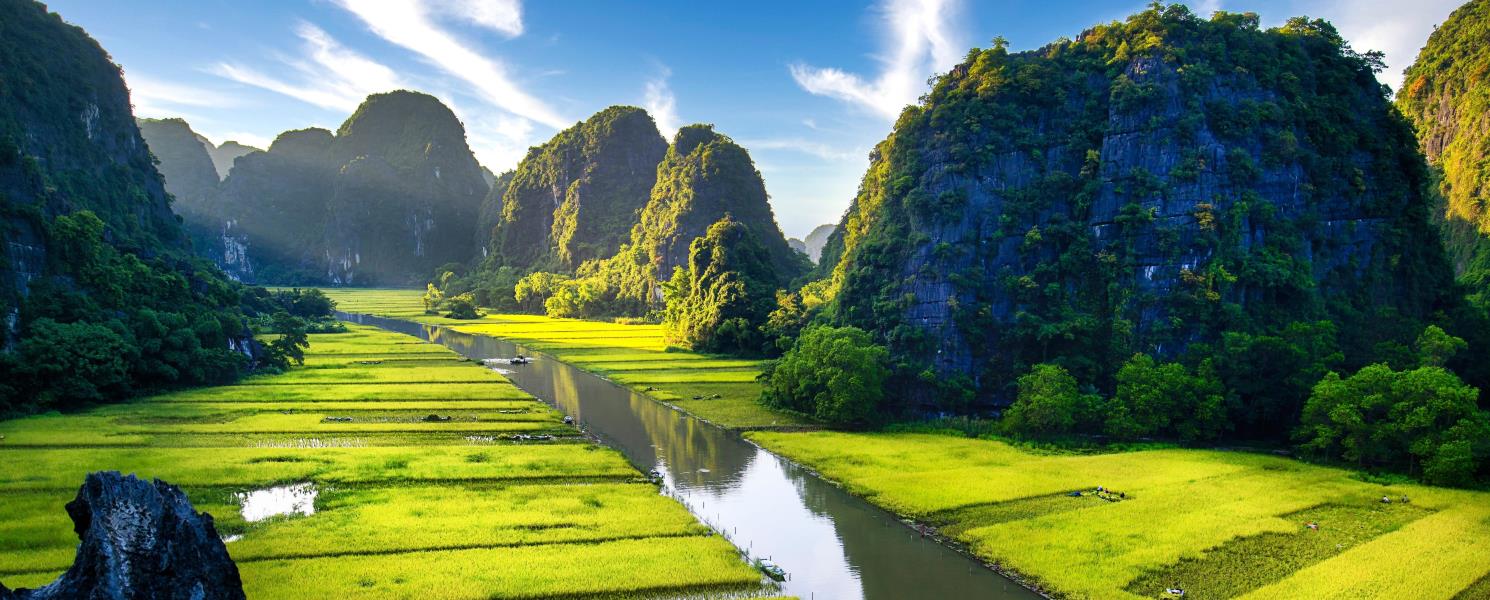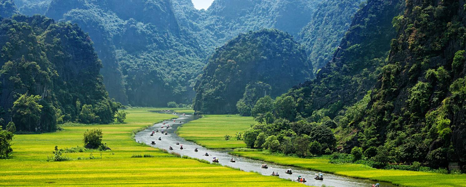 位在河內南方約100多公里處,在北越稱為「Hua Lu Tam Coc」。此處河流平穩、河床不深,可放心遊船瀏覽山湖之景。素有陸上下龍灣之稱的陸龍灣與下龍灣同樣為石灰岩地形,群山環繞、生態田園風光、寧靜鄉村景色。