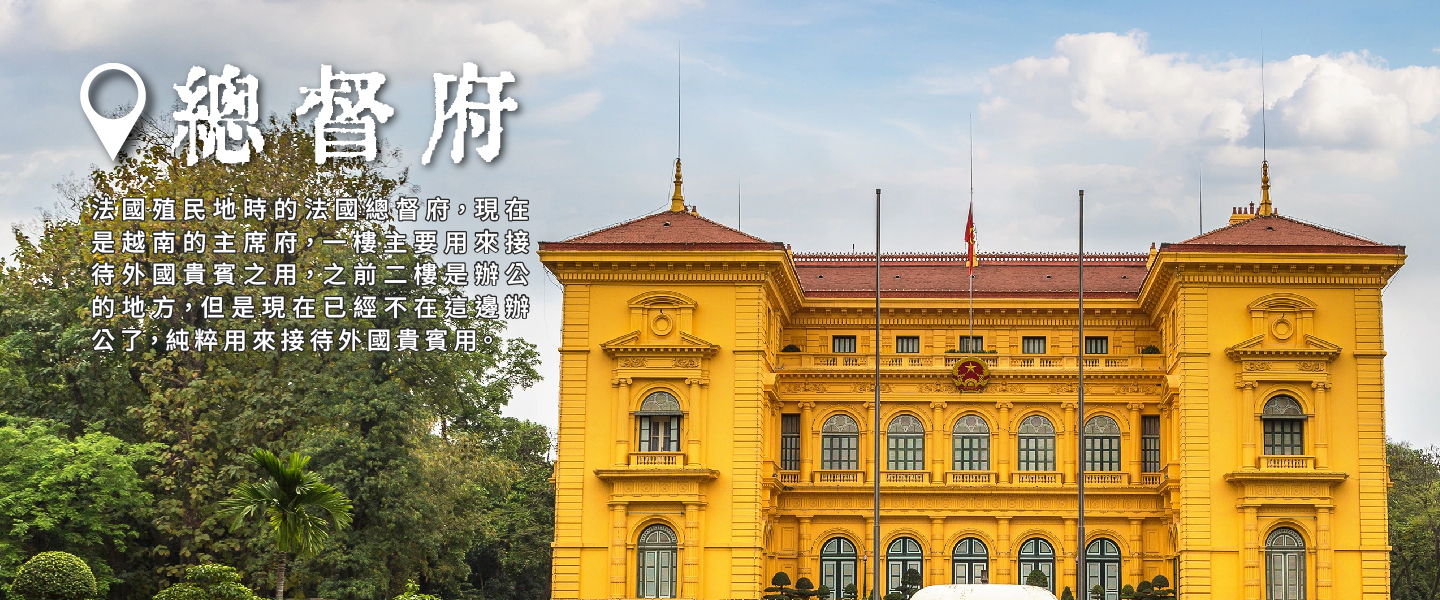 【總督府】又名《主席府》建於1906年的黃色法式建築,原是殖民時期印度支那的總督府,為胡志明主席處理國政之處。