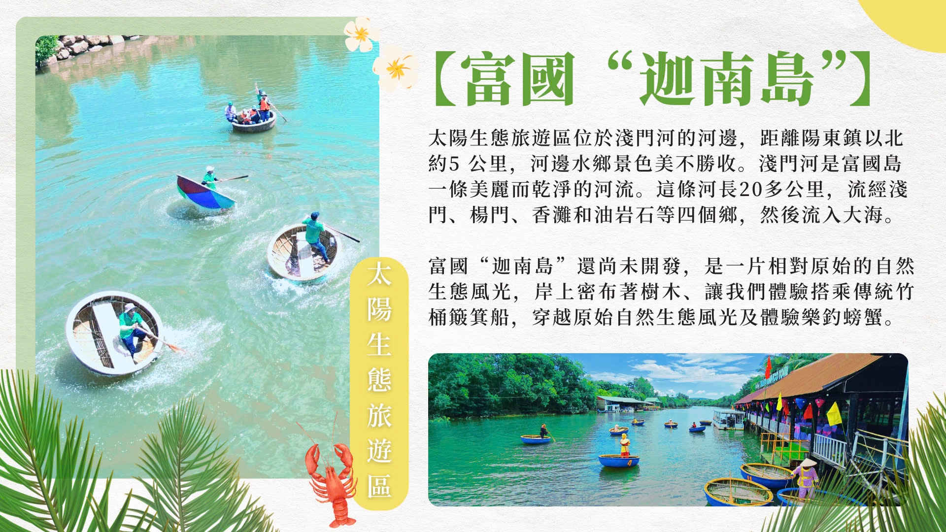 【富國 迦南島(乘坐竹籃船體驗)】位於太陽生態遊園區前門河的河邊,距離楊東鎮以北約5公里,河邊水鄉景色美不勝收。是一片原始的自然生態風光, 岸上密布著樹木,體驗搭乘傳統竹桶簸箕船,穿越原始自然生態風光。※請自付船家小費usd1或2萬越南盾。