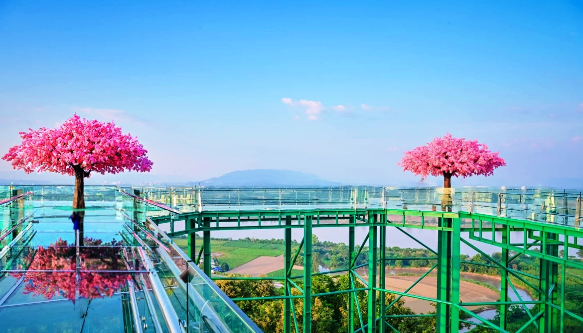 【清萊天空步道】全國最新一座天空步道本周在最北府治清萊正式啟用。參觀亮點之一,就是登上步道後能同時飽覽泰、緬、寮,這是清萊的最新景點,位置與金三角距離不遠。傳統古老寺廟因在山丘上,俯瞰著整個湄公河與寮國,而建出極具現代感的空中步道,延伸出來讓景色看得更廣更清楚,還可以渺瞰旁邊的清盛古城甚至是金三角。