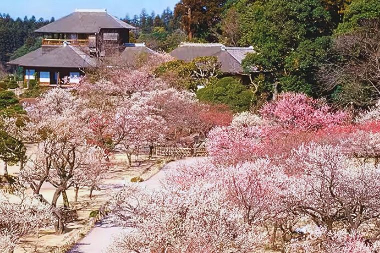 【水戶偕樂園】是水戶籓(現在的茨城縣水戶市)第9代籓主德川齊昭親自設計規劃的池泉迴遊自然風景式的大名庭園,由1841年4月動工,1842年7月完成,和石川縣金澤市的兼六園、岡山縣岡山市的後樂園同稱日本三大名園,尤其以梅花聞名。1999年7月,偕樂園和旁邊的千波公園合併為「偕樂園公園」,成為佔地47萬平方公尺,世界上面積第二大,僅次於紐約中央公園的都市公園。日本歷史公園百選,史跡名勝。