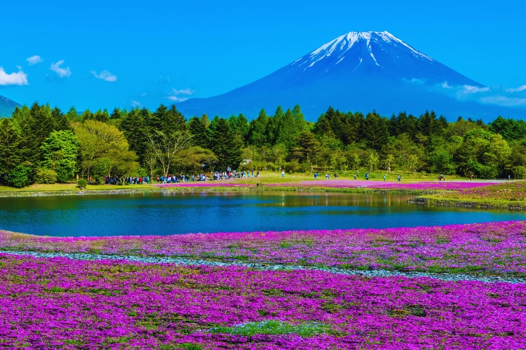 【富士芝櫻祭】在兩萬四千平方公尺的栽植面積裡,廣大的粉紅色美景映入您的眼簾,粉紅春色、新綠蒼林及雄偉富士山為背景之下,70萬株的芝櫻以龍型為構圖的在龍神池畔盤踞成一條巨龍,巧妙配置濃淡不一的紅、粉紅、白色的花朵相間隔成紅龍身上一條條美麗的紋路,芝櫻編織成的花彩圖騰就如絨毯般熱鬧的在大地展開來,芝櫻被稱為『開花地被』花朵貌似櫻花但比櫻花細小,共有紫、白、紅、粉紅、淡粉、雪青各種花色,花密集而鮮豔,朵朵小花形成大片花被,聞起來略有花香。
