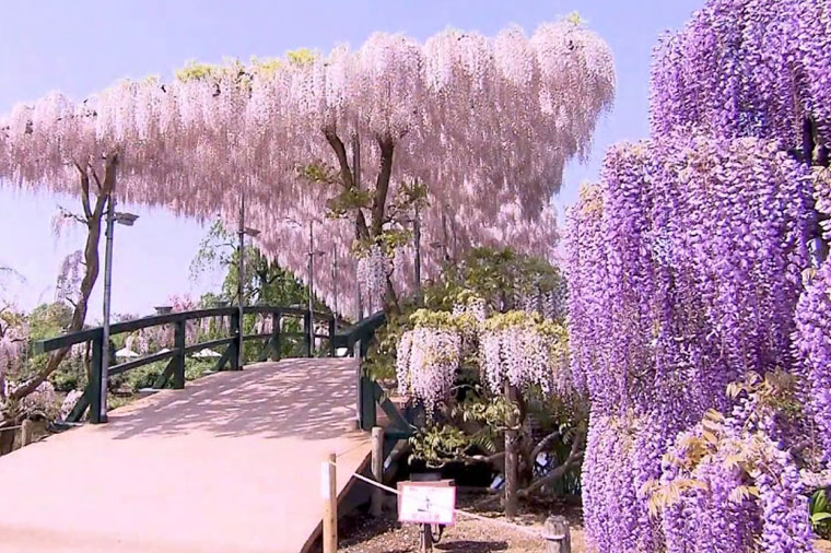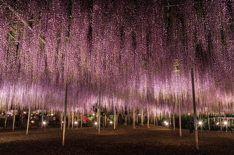 【足利花卉公園】最具代表的花卉,屬於多年生藤蔓植物,莖具纏繞性,直徑達10公分以上,常被用作棚架觀賞植物,花狀花序側生在枝端,20~30朵紫色小花整齊排列,開花時蝶形花朵成串下垂,長度可達15~30公分,花量大時彷彿紫色瀑布,美得令人屏息。公園裡的紫藤約300棵,每逢盛開時聲勢驚人,被公認是全世界最漂亮的紫藤花美景。